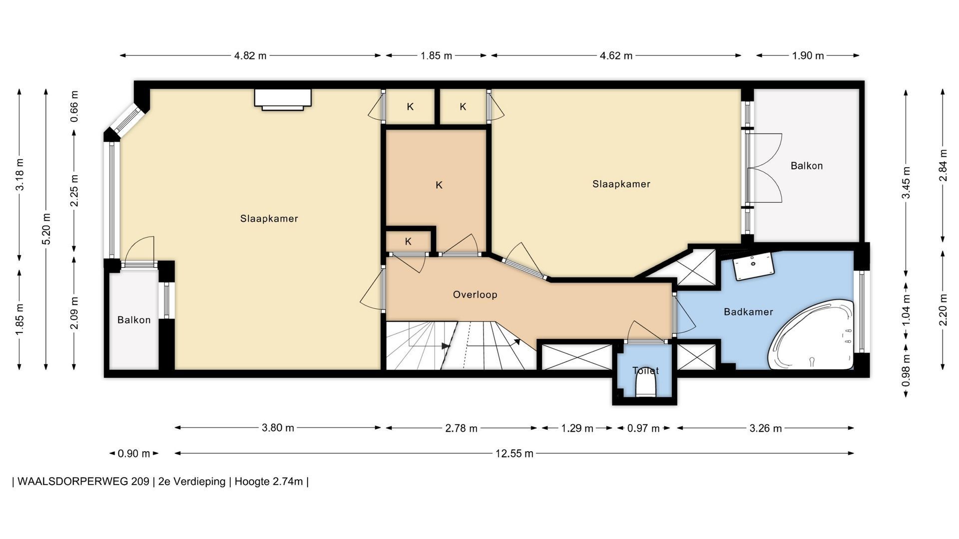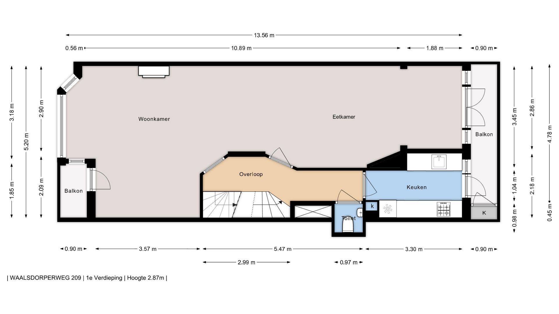 Entree, meterkast, trap naar eerste verdieping, ruime woon- eetkamer met voor - en achter een balkon. Keuken met toegang naar balkon, w.c. Trap naar tweede verdieping, zeer ruime slaapkamer aan de voorzijde, een grote inbouwkast op de gang en een grote...